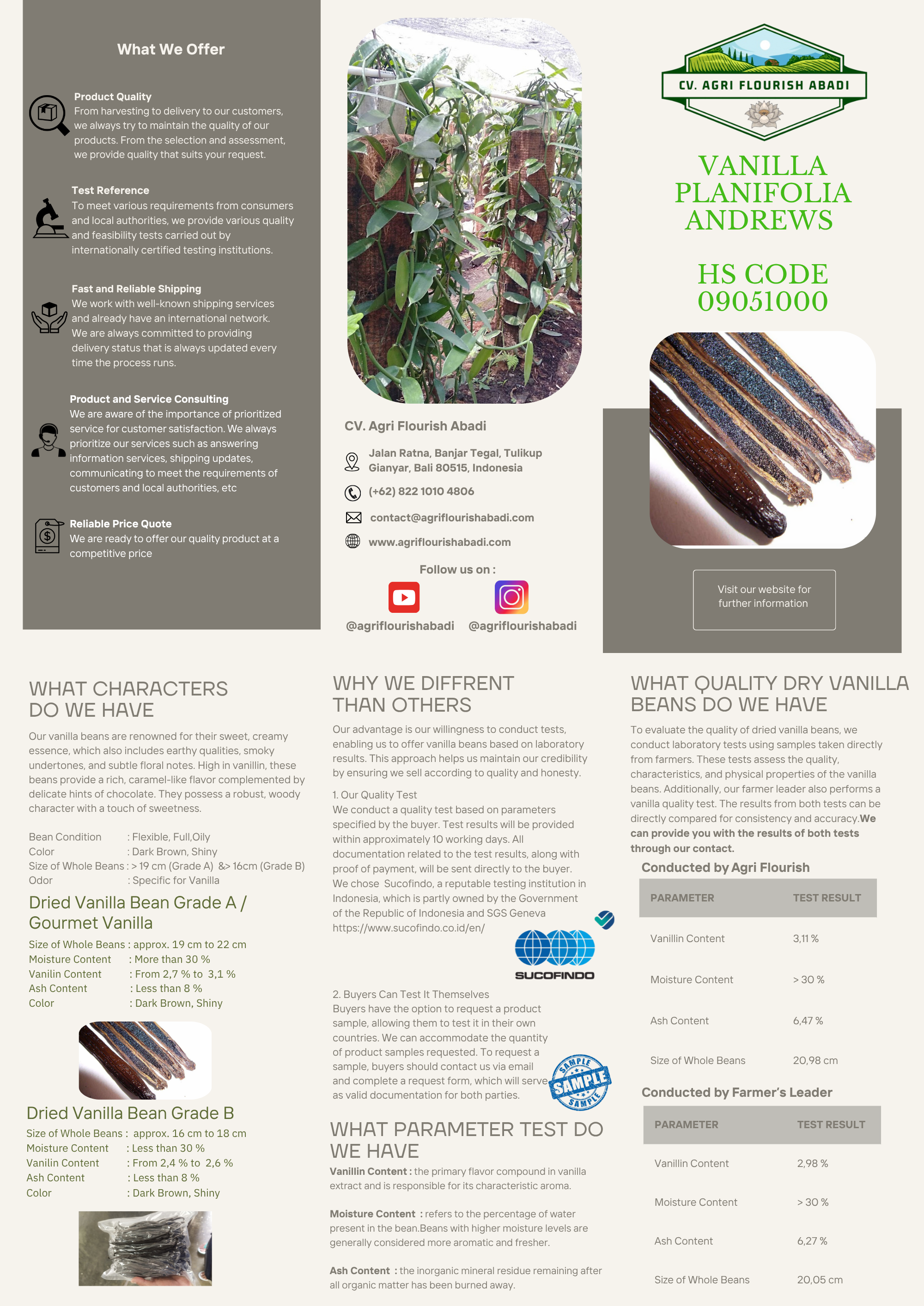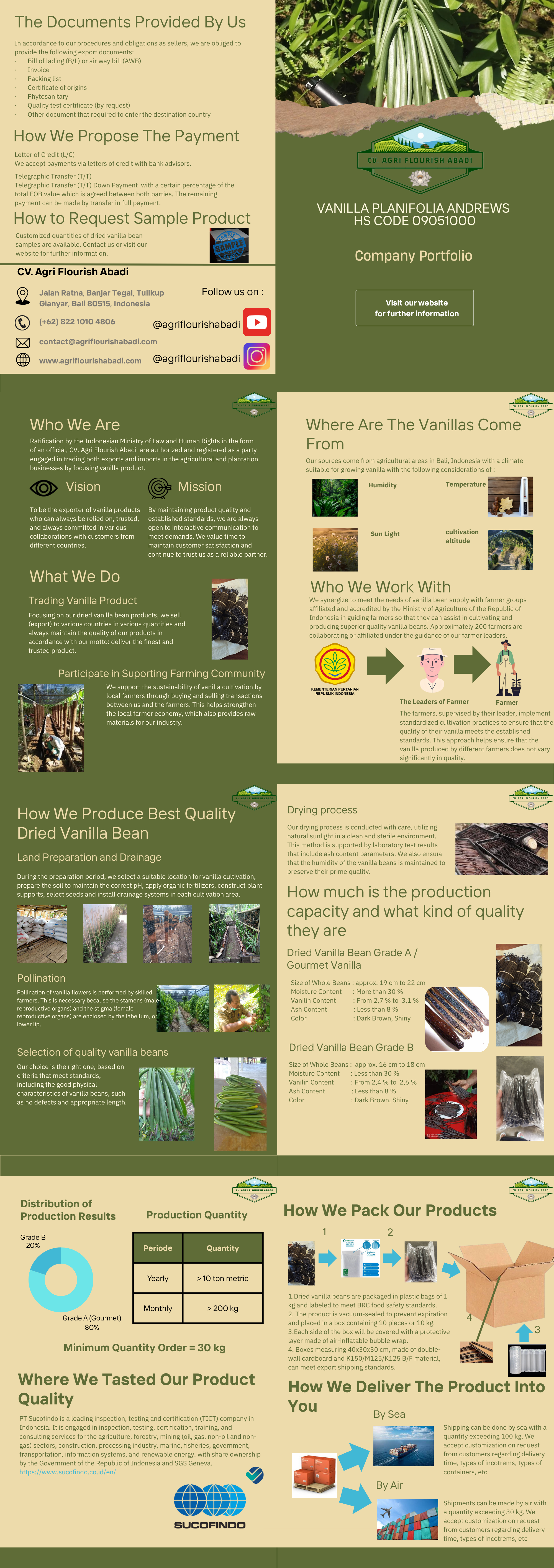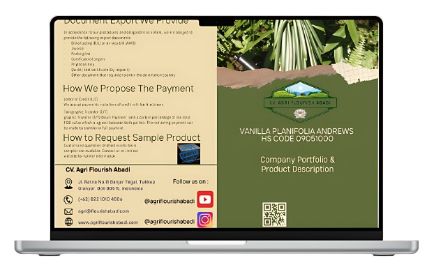 CV Agri Flourish Abadi is an authorized and registered company engaged in the trading, both export and import of products in the agricultural and plantation sectors with a focus on vanilla products. Based in Bali, Indonesia, we collaborate with local farmers to promote empowerment and provide high-quality vanilla products including our main offering dried vanilla beans.